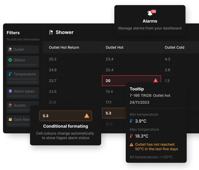 Dashboards are at the centre of the Xiveillance platform for Legionella compliance, providing all the information you require at your fingertips.